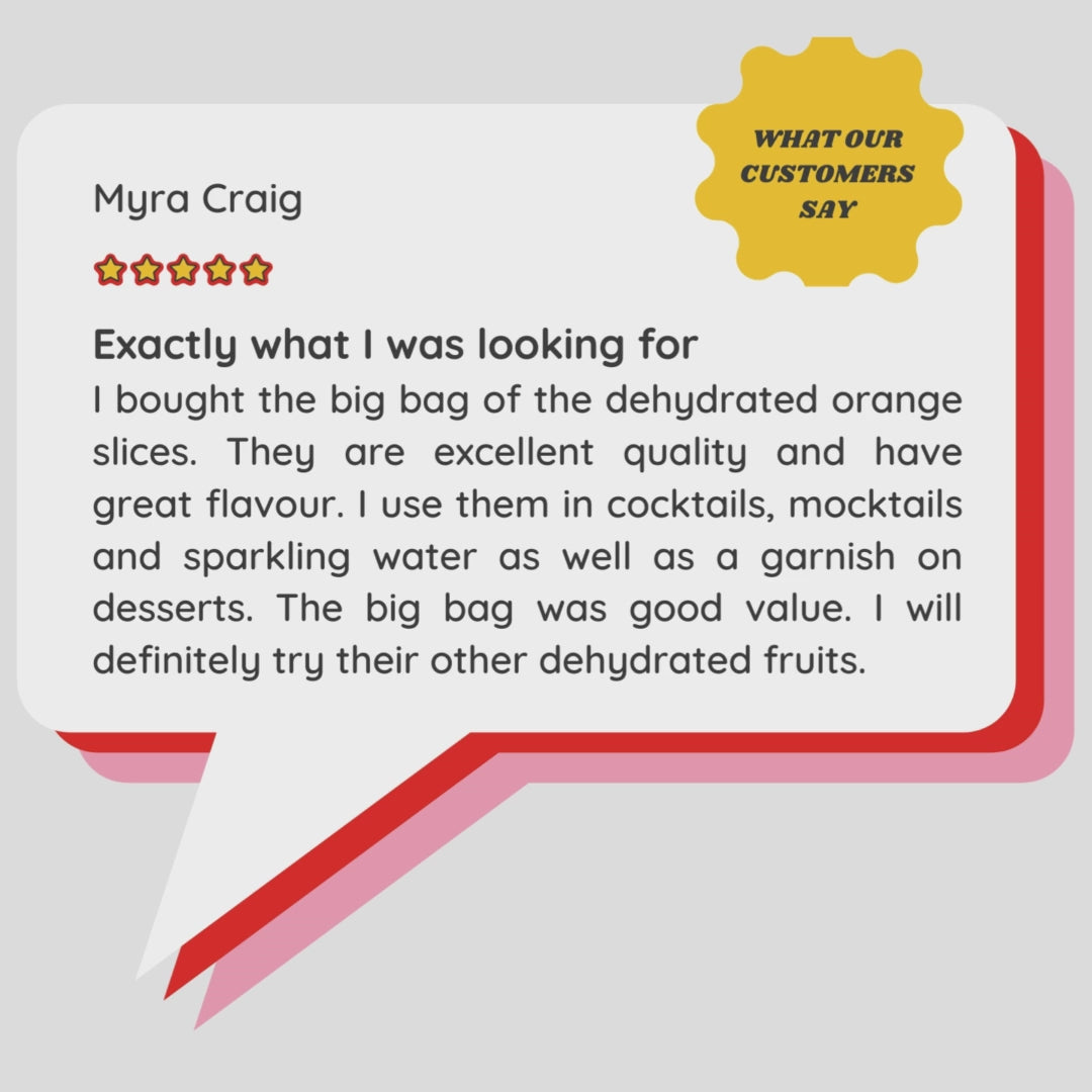 Thank you for your kind words! We're thrilled to hear that you enjoyed the colour, taste, and service of our Dehydrated Oranges. We take great care in packing our products to ensure they arrive in perfect condition. We hope you continue to enjoy the delicious smell of our dehydrated fruit. Thank you for choosing our brand!